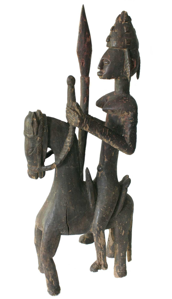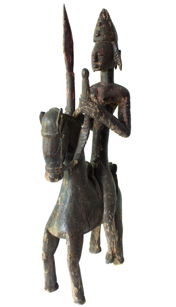 Equestrian Figure Bamana and Dogon equestrian figures reflect the prestige and power surrounding horses and thus their riders. Horses in the Bambara tradition, and elsewhere, are associated with royalty, masculinity and warriors. The horse was introduced to the Bambara by Moslems and quickly became the major symbol of male status. The owner of a horse was not only rich but also worldly, for horses were the best means of movement, long-distance communication, trade and warfare. See Sets, Series and Ensembles in African Art by George Nelson Preston, 1985.