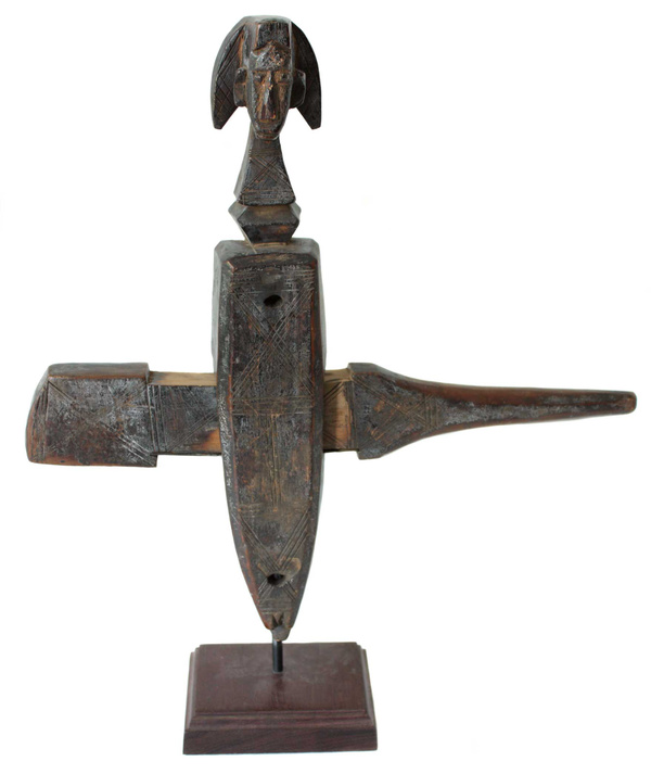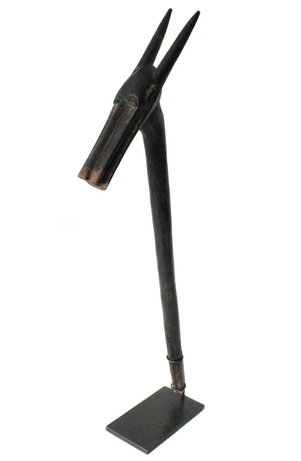 Horizontal Female Chi Wara Chi WaraThe Bambara of Mali are notable highly successful farmers, as they were when the first slave ships traveled the Atlantic from the sources of the Senegal and Gambia rivers to the Gulf Coast of Louisiana at the Mississippi Sound onto Ile Dauphine and on through Lake Borgne and Lake Pontchartrain to Bayou St. Jean or to the Balise and up Mississippi River, to New Orleans in the early years of the 18th century. The Bambara attributed their success to the lessons learned from a half-human, half-animal deity called chi wara, "working wild animal." Chi wara (or tsi wara), with his hooves and his mother's pointed stick, tilled the soil and turned wild grasses into grain. But because the people wasted the grain, chi wara returned to the earth. The farmers then created art and dance to recall him and his powers over nature. These headdresses feature the antelope, giving visual form to important religious beliefs about fertility and growth. They were worn in dances at the beginning of the rainy season (or when a fallow field was re-seeded) to assure a good harvest. Dancers who wore these headdresses covered their bodies with long grasses and cloth. They went bent over using two canes, believing that if they stood upright, they would offend the deity. The dancers accompanied farmers to the fields, supervised the planting, and then returned to the village where they danced. The dance consisted of jumps, sudden leaps and turns reminiscent of the actions of the antelope. Three different styles of chi wara headdresses have been associated with distinct geographic areas within Mali. The first is a vertical style in which the body and legs of the male antelope are small, but the mane, nuzzle and horns are elongated and elaborated. Its open work mane with a zigzag pattern is said to represent the course of the sun across the sky during the agricultural year. The female antelope in contrast is depicted simply as carrying a young on its back. This vertical style is typically found in the eastern parts of Mali (Segou region). The second is a horizontal representation of the antelope, generally more accurately showing the proportions of the animal. These are found in the northwest (Bamako region). The third type, from the southwest (Bougouni region), is highly abstract, generally smaller and included forms primarily of the antelope, but also of the aardvark and the pangolin (scaly anteater).