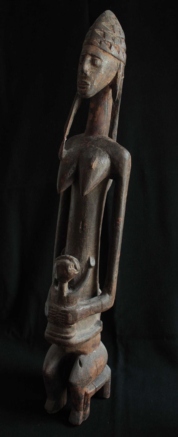 Mother & Child Sculptures of mother and child are relatively rare in the art of the Bambara peoples of Mali. Recent scholarship has linked these works with important cultural beliefs about fertility and childbearing. Annual celebrations of the Jo society were held to enable women to assure the birth of many children. This event included festivities and sacrifices but most importantly, the display of an array of wooden sculptures in which the mother and child, called gwandusu, held a central position. The sculpture, surrounded by others including male and female figures was intended to attract attention, focus the eye and direct the thoughts of participants. Gwan, translated into English, means hot, hard and difficult. Dusu means soul, heart, passion, character, courage, and anger. Together they represent a strong and powerful female. In the festival, the sculpture would have been decorated with beads, horns, belts, fabric and, perhaps, a hat. The importance of the mother is indicated by her seated position; a position of honor in Bambara society. The child in the arms of the mother also refers to the importance of the mother in the lives of her children. The child, in Bambara sculptures, is always shown in the arms of the mother, never held by the father. The style of the gwandusu sculptures differs from other types of Bambara carvings. Her torso is elongated with flowing transitions between body parts. Her breasts curve downward and her large eyes with heavy lids look downward towards her child.