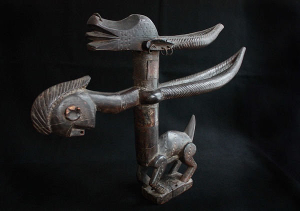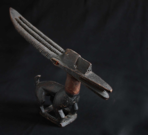 Horizontal Chi Wara with Pangolin on Basket Chi WaraThe Bambara of Mali are notable highly successful farmers, as they were when the first slave ships traveled the Atlantic from the sources of the Senegal and Gambia rivers to the Gulf Coast of Louisiana at the Mississippi Sound onto Ile Dauphine and on through Lake Borgne and Lake Pontchartrain to Bayou St. Jean or to the Balise and up Mississippi River, to New Orleans in the early years of the 18th century. The Bambara attributed their success to the lessons learned from a half-human, half-animal deity called chi wara, "working wild animal." Chi wara (or tsi wara), with his hooves and his mother's pointed stick, tilled the soil and turned wild grasses into grain. But because the people wasted the grain, chi wara returned to the earth. The farmers then created art and dance to recall him and his powers over nature. These headdresses feature the antelope, giving visual form to important religious beliefs about fertility and growth. They were worn in dances at the beginning of the rainy season (or when a fallow field was re-seeded) to assure a good harvest. Dancers who wore these headdresses covered their bodies with long grasses and cloth. They went bent over using two canes, believing that if they stood upright, they would offend the deity. The dancers accompanied farmers to the fields, supervised the planting, and then returned to the village where they danced. The dance consisted of jumps, sudden leaps and turns reminiscent of the actions of the antelope. Three different styles of chi wara headdresses have been associated with distinct geographic areas within Mali. The first is a vertical style in which the body and legs of the male antelope are small, but the mane, nuzzle and horns are elongated and elaborated. Its open work mane with a zigzag pattern is said to represent the course of the sun across the sky during the agricultural year. The female antelope in contrast is depicted simply as carrying a young on its back. This vertical style is typically found in the eastern parts of Mali (Segou region). The second is a horizontal representation of the antelope, generally more accurately showing the proportions of the animal. These are found in the northwest (Bamako region). The third type, from the southwest (Bougouni region), is highly abstract, generally smaller and included forms primarily of the antelope, but also of the aardvark and the pangolin (scaly anteater).