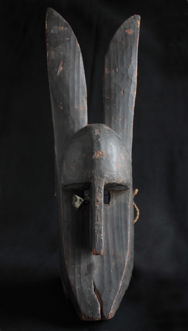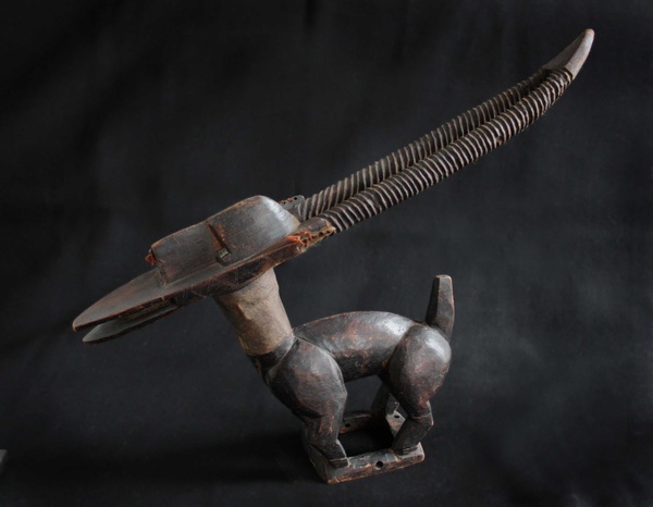 Male Tsi Wara Headdress Chi WaraThe Bambara of Mali are notable highly successful farmers, as they were when the first slave ships traveled the Atlantic from the sources of the Senegal and Gambia rivers to the Gulf Coast of Louisiana at the Mississippi Sound onto Ile Dauphine and on through Lake Borgne and Lake Pontchartrain to Bayou St. Jean or to the Balise and up Mississippi River, to New Orleans in the early years of the 18th century. The Bambara attributed their success to the lessons learned from a half-human, half-animal deity called chi wara, "working wild animal." Chi wara (or tsi wara), with his hooves and his mother's pointed stick, tilled the soil and turned wild grasses into grain. But because the people wasted the grain, chi wara returned to the earth. The farmers then created art and dance to recall him and his powers over nature. These headdresses feature the antelope, giving visual form to important religious beliefs about fertility and growth. They were worn in dances at the beginning of the rainy season (or when a fallow field was re-seeded) to assure a good harvest. Dancers who wore these headdresses covered their bodies with long grasses and cloth. They went bent over using two canes, believing that if they stood upright, they would offend the deity. The dancers accompanied farmers to the fields, supervised the planting, and then returned to the village where they danced. The dance consisted of jumps, sudden leaps and turns reminiscent of the actions of the antelope. Three different styles of chi wara headdresses have been associated with distinct geographic areas within Mali. The first is a vertical style in which the body and legs of the male antelope are small, but the mane, nuzzle and horns are elongated and elaborated. Its open work mane with a zigzag pattern is said to represent the course of the sun across the sky during the agricultural year. The female antelope in contrast is depicted simply as carrying a young on its back. This vertical style is typically found in the eastern parts of Mali (Segou region). The second is a horizontal representation of the antelope, generally more accurately showing the proportions of the animal. These are found in the northwest (Bamako region). The third type, from the southwest (Bougouni region), is highly abstract, generally smaller and included forms primarily of the antelope, but also of the aardvark and the pangolin (scaly anteater).