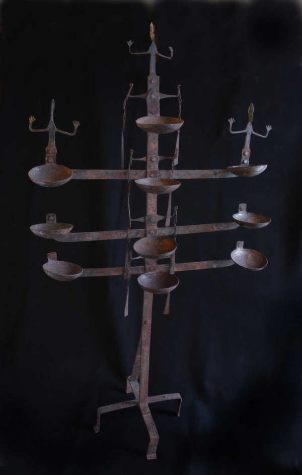 Large Iron Lamp, Fitinew Created by Mande blacksmiths, iron lamps played an important role in both secular and sacred events of the Bambara (Bamana) peoples of Mali. Big lamps were used to illuminate nighttime performances, ceremonies, weddings and celebrations. The flattened cups were basins for oil made from the karite nut. A wick of twisted cotton was placed inside each cup and draped over the edge to be lit at the time of the event. It is said that the cups were to represent the human mouth and the wicks signified the human tongue. Several of the cups on this lamp have a spatula hanging from the end of a chain. The purpose of this feature probably is to extinguish the flames. The other notable feature of this lamp, having a relationship to Mande script and signs, are the three human figures that top the three highest cups. In Bambara religious beliefs, both the mouth and the tongue are sources of the spiritual concept of Nyama. Nyama is the basic energy, force and power that resides in every human being. It has been called the "energy of action... the necessary power source behind every movement, every task." [McNaughton, p.l4] The head was regarded as the seat of intelligence. It, in turn, is supported by the hands, which convert thoughts to actions. While the representation of these human figures is abstract rather than realistic, the motif of horizontal limbs turned up at the elbow is a shape repeated in other parts of the lamp (such as the thin rods to which the spatulas are attached and the framework holding the cups). Thus this lamp, and others like it, makes reference again and again to the human form, for the Bambara believed that humanity is the reason for the existence of the universe. But religion and philosophy were not the only context for the construction of lamps like this one. They also served secular purposes. One of the most interesting was to illuminate wrestling matches at night. Some of these lamps were said to contain 100 cups. Wrestling is a popular sport in West Africa. The matches were spectacles with musicians, magicians, poets and sorcerers. Much like our athletes today, a successful wrestler was accorded great fame and respect.