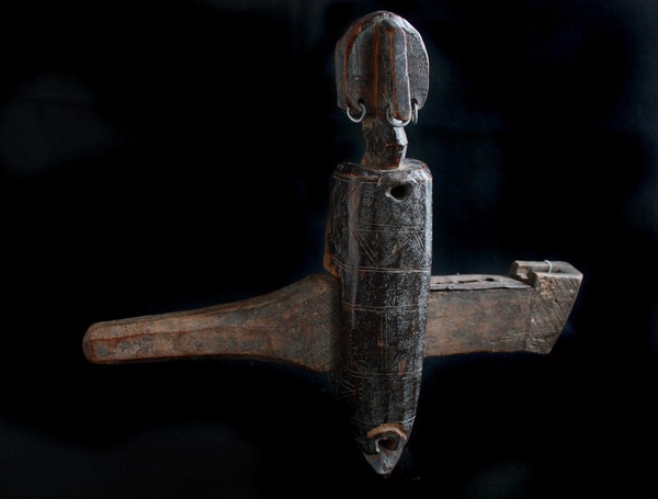 Door Lock with Horizontal Bar Door LocksAs recently as 60 years ago. the houses in the villages of the Bambara in Mali were distinctive because of finely carved wooden door locks. These locks, ranging in size from 12 to 18 inches, depicted humans, animals or abstract forms. The forms on any particular lock reflected religious beliefs or legends of the community. Frequently, the locks were incised with signs or marks, either by carving or by burning with the hot edge of a knife blade. The marks were power symbols chosen to enhance the overall symbolism of the lock. Mechanically, the locks consisted of two parts. The vertical element which was nailed to the door, and the horizontal element or bolt, that secured the door to the frame. The bolt typically had five parts that together resulted in a locking mechanism that was highly secure against those who didn't know how to use the key. But the importance of the lock had little to do with its physical complexity and strength. Rather, the power of the lock came from its magical content, whether real or imagined. These door locks were intended to prohibit the entrance into the house of evil persons or evil spirits. In particular, the locks were one part of a widespread effort to control Nyale. Nyale is the god or life force that represents creativity and fertility and energy, but unless controlled results in chaos. The strength and complexity of the locks was reinforced by the perceived power of the forces of stability and calm to deal with any intruders. For example, the inverted triangular form at the base of the vertical pieces of these locks could represent a python's head. The python was regarded as a symbol of god and thus a potent guard against sorcery and magic. Although few wooden doors locks are made today, the motives of double-lined chevrons or X's still appear on wood objects carved in Mali.