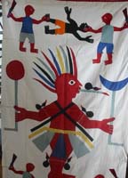 Applique Cloth with Warrior Fon BannersThe Fon peoples of Benin (in pre-colonial times called Dahomey) have a special tradition of textile art that reaches back 300 years. These works are cotton banners, some quite large, on which the symbols of the kings of Dahomey and other symbols of their political power were appliqued. The kings controlled the use and production of these works of art for the purpose of presenting themselves in splendor to the people. The banners were displayed on special occasions on rooftops, on pavilions, on large umbrellas and on hats worn by royalty. The banners were created by family guilds that specialized in textile applique. The guilds maintained vast collections of visual images that a client could specify for a banner. A frequent subject matter for banners were the symbols of the twelve kings of Dahomey. The banner was to be read from left to right and from top to bottom, beginning with the oldest, most ancient kings and ending with the last kings before the country was claimed by France. There were often many symbols for any particular king because the meaning of an image might reflect a distinctive characteristic of the king, such as his strength, or it might commemorate a specific event during the king's reign, or it might relate a magical story about the king. The guild's artist would then design the composition, using the image against a dark or contrasting background. In terms of style, the images - birds, animals, people, weapons and, occasionally, plant life such as vines and trees and fruit - were simple, direct and minimal. They could be readily identified with the essence of the object. As such, they became symbols rather than detailed reproductions. While the symbols for many of the kings were animals or birds or the head of a defeated enemy placed in a pot, the symbol for King Agadja was quite special. King Agadja ruled during the period when slaves from Dahomey were taken to Louisiana, that is, between 1719 and 1732. His symbol was a huge sailing ship, a European caravel boat. Appliqued cloths made today in Benin and in the US continue to contain the simple, symbolic images of the older traditions. However, the works are less likely to contain the aggressive and war like images of the older royal messages.
