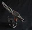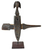 Small Iron Lamp, Fitinew Created by Mande blacksmiths, iron lamps played an important role in both secular and sacred events of the Bambara (Bamana) peoples of Mali. Big lamps were used to illuminate nighttime performances, ceremonies, weddings and celebrations. The flattened cups were basins for oil made from the karite nut. A wick of twisted cotton was placed inside each cup and draped over the edge to be lit at the time of the event. It is said that the cups were to represent the human mouth and the wicks signified the human tongue. Several of the cups on this lamp have a spatula hanging from the end of a chain. The purpose of this feature probably is to extinguish the flames. The other notable feature of this lamp, having a relationship to Mande script and signs, are the three human figures that top the three highest cups. In Bambara religious beliefs, both the mouth and the tongue are sources of the spiritual concept of Nyama. Nyama is the basic energy, force and power that resides in every human being. It has been called the "energy of action... the necessary power source behind every movement, every task." [McNaughton, p.l4] The head was regarded as the seat of intelligence. It, in turn, is supported by the hands, which convert thoughts to actions. While the representation of these human figures is abstract rather than realistic, the motif of horizontal limbs turned up at the elbow is a shape repeated in other parts of the lamp (such as the thin rods to which the spatulas are attached and the framework holding the cups). Thus this lamp, and others like it, makes reference again and again to the human form, for the Bambara believed that humanity is the reason for the existence of the universe. But religion and philosophy were not the only context for the construction of lamps like this one. They also served secular purposes. One of the most interesting was to illuminate wrestling matches at night. Some of these lamps were said to contain 100 cups. Wrestling is a popular sport in West Africa. The matches were spectacles with musicians, magicians, poets and sorcerers. Much like our athletes today, a successful wrestler was accorded great fame and respect.