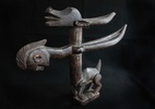 Horizontal Chi Wara with Human Head Chi WaraThe Bambara of Mali are notable highly successful farmers, as they were when the first slave ships traveled the Atlantic from the sources of the Senegal and Gambia rivers to the Gulf Coast of Louisiana at the Mississippi Sound onto Ile Dauphine and on through Lake Borgne and Lake Pontchartrain to Bayou St. Jean or to the Balise and up Mississippi River, to New Orleans in the early years of the 18th century. The Bambara attributed their success to the lessons learned from a half-human, half-animal deity called chi wara, "working wild animal." Chi wara (or tsi wara), with his hooves and his mother's pointed stick, tilled the soil and turned wild grasses into grain. But because the people wasted the grain, chi wara returned to the earth. The farmers then created art and dance to recall him and his powers over nature. These headdresses feature the antelope, giving visual form to important religious beliefs about fertility and growth. They were worn in dances at the beginning of the rainy season (or when a fallow field was re-seeded) to assure a good harvest. Dancers who wore these headdresses covered their bodies with long grasses and cloth. They went bent over using two canes, believing that if they stood upright, they would offend the deity. The dancers accompanied farmers to the fields, supervised the planting, and then returned to the village where they danced. The dance consisted of jumps, sudden leaps and turns reminiscent of the actions of the antelope. Three different styles of chi wara headdresses have been associated with distinct geographic areas within Mali. The first is a vertical style in which the body and legs of the male antelope are small, but the mane, nuzzle and horns are elongated and elaborated. Its open work mane with a zigzag pattern is said to represent the course of the sun across the sky during the agricultural year. The female antelope in contrast is depicted simply as carrying a young on its back. This vertical style is typically found in the eastern parts of Mali (Segou region). The second is a horizontal representation of the antelope, generally more accurately showing the proportions of the animal. These are found in the northwest (Bamako region). The third type, from the southwest (Bougouni region), is highly abstract, generally smaller and included forms primarily of the antelope, but also of the aardvark and the pangolin (scaly anteater).