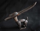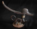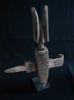 Abstract Chi Wara with Fur Chi WaraThe Bambara of Mali are notable highly successful farmers, as they were when the first slave ships traveled the Atlantic from the sources of the Senegal and Gambia rivers to the Gulf Coast of Louisiana at the Mississippi Sound onto Ile Dauphine and on through Lake Borgne and Lake Pontchartrain to Bayou St. Jean or to the Balise and up Mississippi River, to New Orleans in the early years of the 18th century. The Bambara attributed their success to the lessons learned from a half-human, half-animal deity called chi wara, "working wild animal." Chi wara (or tsi wara), with his hooves and his mother's pointed stick, tilled the soil and turned wild grasses into grain. But because the people wasted the grain, chi wara returned to the earth. The farmers then created art and dance to recall him and his powers over nature. These headdresses feature the antelope, giving visual form to important religious beliefs about fertility and growth. They were worn in dances at the beginning of the rainy season (or when a fallow field was re-seeded) to assure a good harvest. Dancers who wore these headdresses covered their bodies with long grasses and cloth. They went bent over using two canes, believing that if they stood upright, they would offend the deity. The dancers accompanied farmers to the fields, supervised the planting, and then returned to the village where they danced. The dance consisted of jumps, sudden leaps and turns reminiscent of the actions of the antelope. Three different styles of chi wara headdresses have been associated with distinct geographic areas within Mali. The first is a vertical style in which the body and legs of the male antelope are small, but the mane, nuzzle and horns are elongated and elaborated. Its open work mane with a zigzag pattern is said to represent the course of the sun across the sky during the agricultural year. The female antelope in contrast is depicted simply as carrying a young on its back. This vertical style is typically found in the eastern parts of Mali (Segou region). The second is a horizontal representation of the antelope, generally more accurately showing the proportions of the animal. These are found in the northwest (Bamako region). The third type, from the southwest (Bougouni region), is highly abstract, generally smaller and included forms primarily of the antelope, but also of the aardvark and the pangolin (scaly anteater).