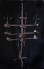 Large Iron Lamp, Fitinew Created by Mande blacksmiths, iron lamps played an important role in both secular and sacred events of the Bambara (Bamana) peoples of Mali. Big lamps were used to illuminate nighttime performances, ceremonies, weddings and celebrations. The flattened cups were basins for oil made from the karite nut. A wick of twisted cotton was placed inside each cup and draped over the edge to be lit at the time of the event. It is said that the cups were to represent the human mouth and the wicks signified the human tongue. Several of the cups on this lamp have a spatula hanging from the end of a chain. The purpose of this feature probably is to extinguish the flames. The other notable feature of this lamp, having a relationship to Mande script and signs, are the three human figures that top the three highest cups. In Bambara religious beliefs, both the mouth and the tongue are sources of the spiritual concept of Nyama. Nyama is the basic energy, force and power that resides in every human being. It has been called the "energy of action... the necessary power source behind every movement, every task." [McNaughton, p.l4] The head was regarded as the seat of intelligence. It, in turn, is supported by the hands, which convert thoughts to actions. While the representation of these human figures is abstract rather than realistic, the motif of horizontal limbs turned up at the elbow is a shape repeated in other parts of the lamp (such as the thin rods to which the spatulas are attached and the framework holding the cups). Thus this lamp, and others like it, makes reference again and again to the human form, for the Bambara believed that humanity is the reason for the existence of the universe. But religion and philosophy were not the only context for the construction of lamps like this one. They also served secular purposes. One of the most interesting was to illuminate wrestling matches at night. Some of these lamps were said to contain 100 cups. Wrestling is a popular sport in West Africa. The matches were spectacles with musicians, magicians, poets and sorcerers. Much like our athletes today, a successful wrestler was accorded great fame and respect.